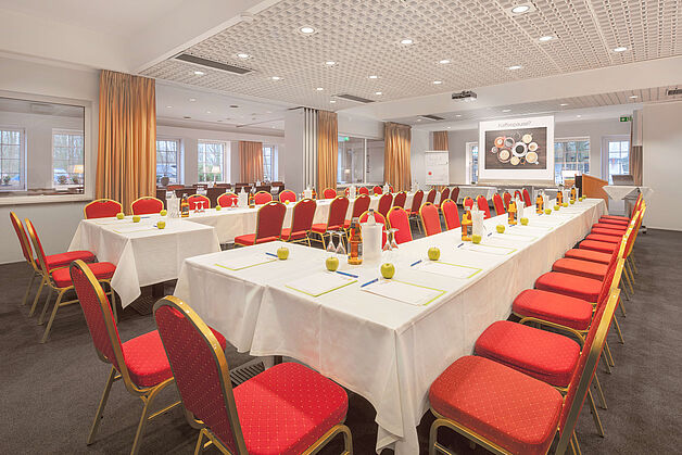 Unser Haus verfügt über Veranstaltungskapazitäten für 10 bis 260 Personen. Nutzen Sie unseren Saal für Ihre Tagung, Ihr Event oder Incentive entweder komplett mit kleiner Bühne oder mit minimierter Quadratmeterzahl für kleinere Seminare, Schulungen oder Workshops. Dank der in Boden und Decke verankerten Trennwände können wir uns flexibel auf Ihre Anforderungen einstellen. Verschaffen Sie sich gerne Vorort einen schnellen Überblick über unsere individuellen Tagungspauschalen, Raummaße und Tagungstechnik.