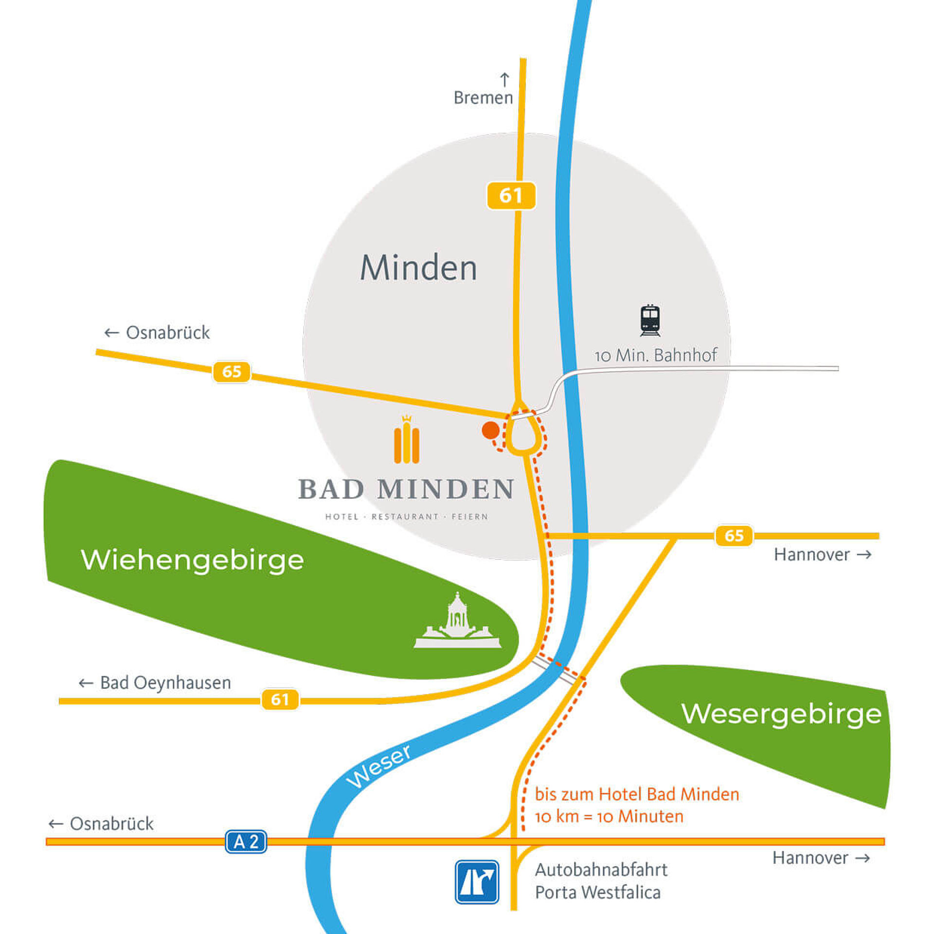 Hier, im schönen Weserbergland, in Minden, liegt unser Betrieb fußläufig vom historischen Stadtkern entfernt und gleichzeitig erreichen Sie in wenigen Autominuten die Autobahn. Es ist eine Region, die für ihre wunderschöne Landschaft mit Weser- und Wiehengebirge, der sich hindurchschlängelnden Weser und ihre vielen romantischen Mühlen bekannt ist und deshalb sogar "Deutsche Märchenstraße" genannt wird. Nicht nur die Radfahrer, die Minden Jahr für Jahr über den 520 Kilometer langen Weserradweg ansteuern, genießen hier ihren Kurzurlaub, auch unsere Tagungsgäste schätzen die gute Infrastruktur verbunden mit den vielen Möglichkeiten für Freizeit- und Erlebnisprogramme in dieser Region.